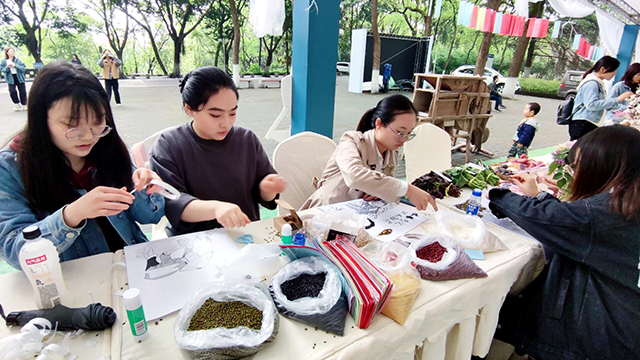 同学耐心讲解。通过对传统农耕文化的追寻,进一步深化同学们的爱农情怀。除此之外,活动现场一幅幅同学们亲手制作的充满生机的种艺画让人眼前一亮的,纸张上简单的黑色线条配上飘香的五谷填充,让农作物弥漫艺术气息,让同学们与农作物更近一步,与农业更进一步。