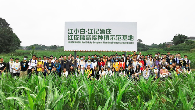 上午,江记农庄总经理周俊峰带领师生们参观高粱种植园。虽然已过采摘季,但育种技术的进步使得红皮糯高粱能在田地里继续生长等待第二次收获。细雨霏霏挡不住同学们满腔的热情,纷纷踏入田地里,欢腾的笑声盖过高耸的高粱杆,青春气息遍布田野。