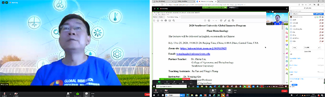 2020年国际课程周(Global Immersion Program2020,GIP2020)大幅调整了课程数量和上课方式。学院申报了4门GIP2020课程,其中《植物生物技术》获批。该课程由美国密苏里州立大学(MSU)QIU Wenpign(邱文平)教授主讲,学院刘志斋为该课程的共课老师。在征得邱老师同意后,课程邀请了硕士研究生谭佳、学院中外合作办学办公室张颖溢,一起组成了授课团队,共同完成课程的教学、课堂管理、课程答疑等工作。