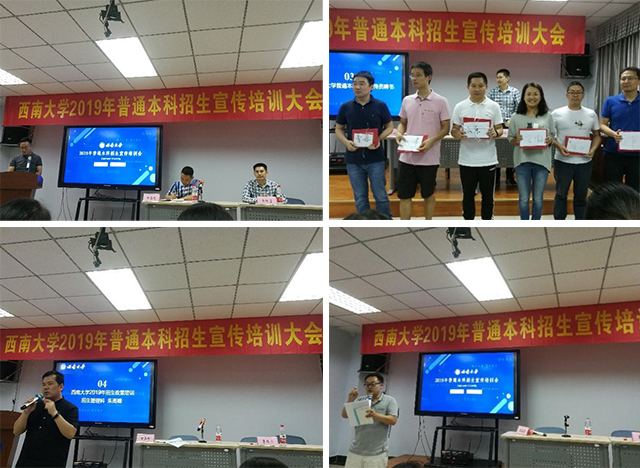 2019年普通本科招生宣传提供”,包括学校概况、招生政策、专业情况、历年分数、艺术类录取政策等。培训会的最后,招生就业处处长李栋宣、副处长田再悦为所有参加此次招生宣传的老师颁发了聘书。