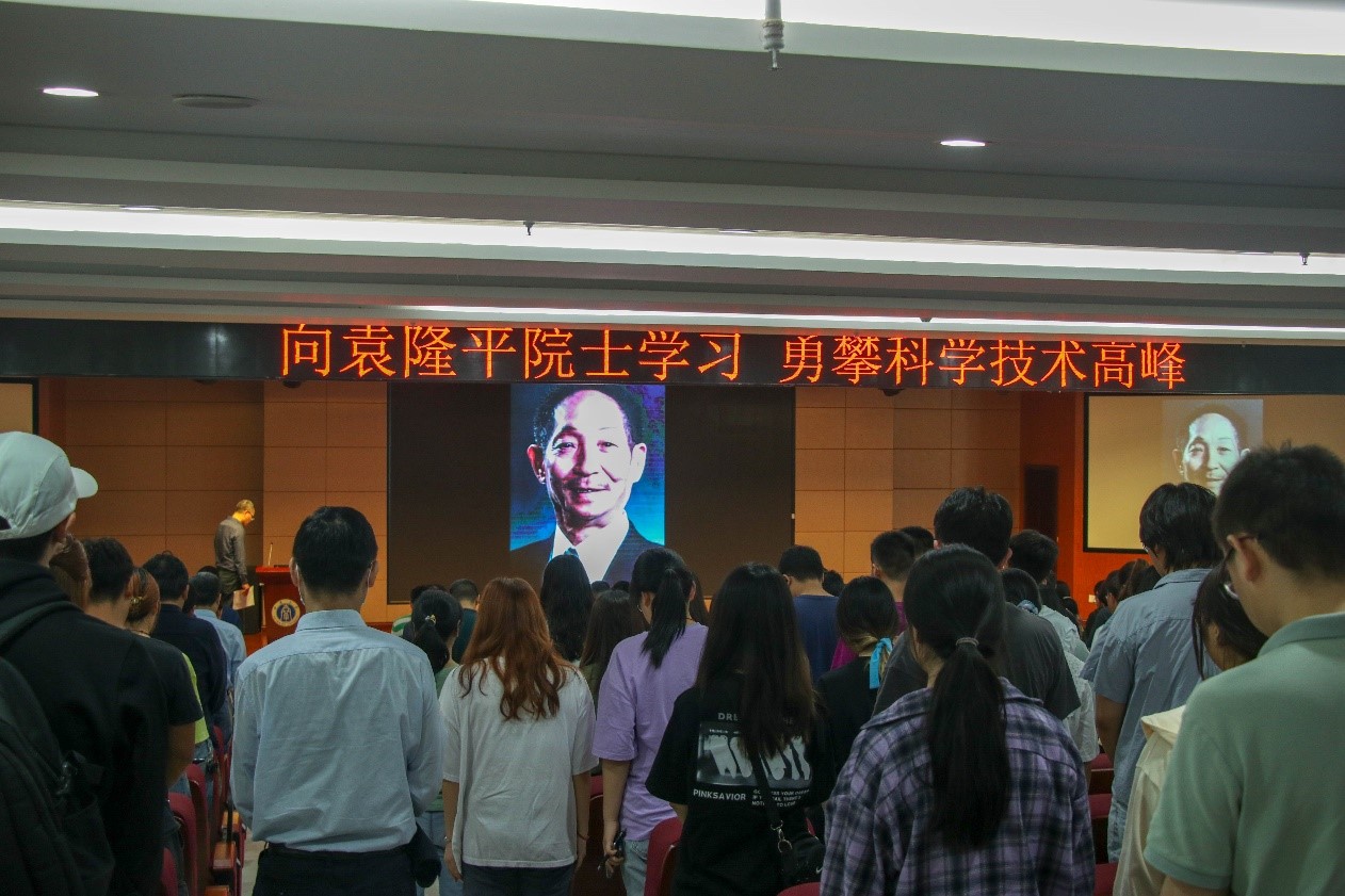 报告会前,全体师生集体起立、默哀,向袁隆平院士表示深切的哀悼。
