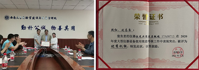 由段红和刘志斋共同管理的“激光共聚焦显微镜”机组获评“优秀机组”。统计数据显示,该仪器自2018年进入学校大型仪器共享网络预约使用以来,严格按照大型共享仪器的要求进行管理,累计为全校近10个学院和研究所室、中心提供服务,取得了良好的效益。