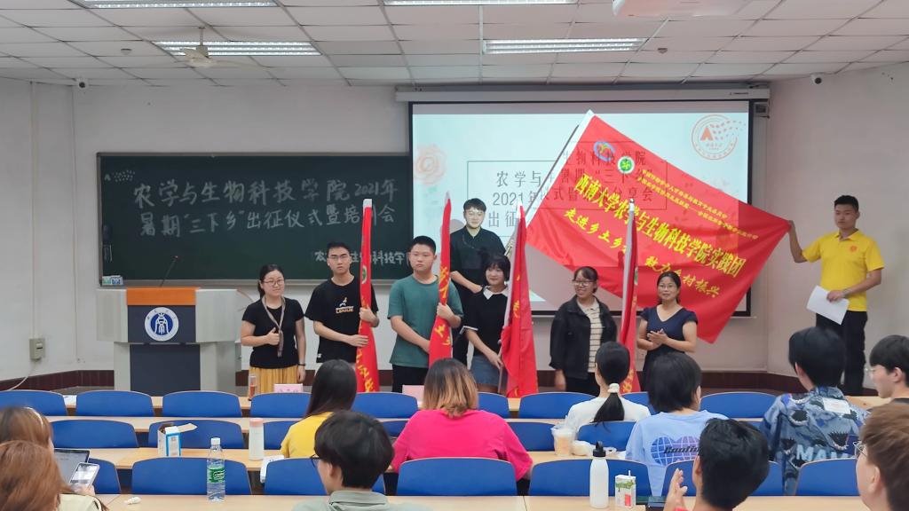 为开展好暑期三下乡社会实践活动,响应“2021年全国农科学子联合实践行动”,2021年7月2日上午9点,学院举行2021年暑期三下乡出征仪式暨培训会,为即将出征的各社会实践队伍授旗并做调研、宣讲、支教等活动如何有效开展及实践过程安全、实践成果宣传等方面专题培训。学院党委副书记郑莉佳老师、团委书记许莹竹老师出席会议。