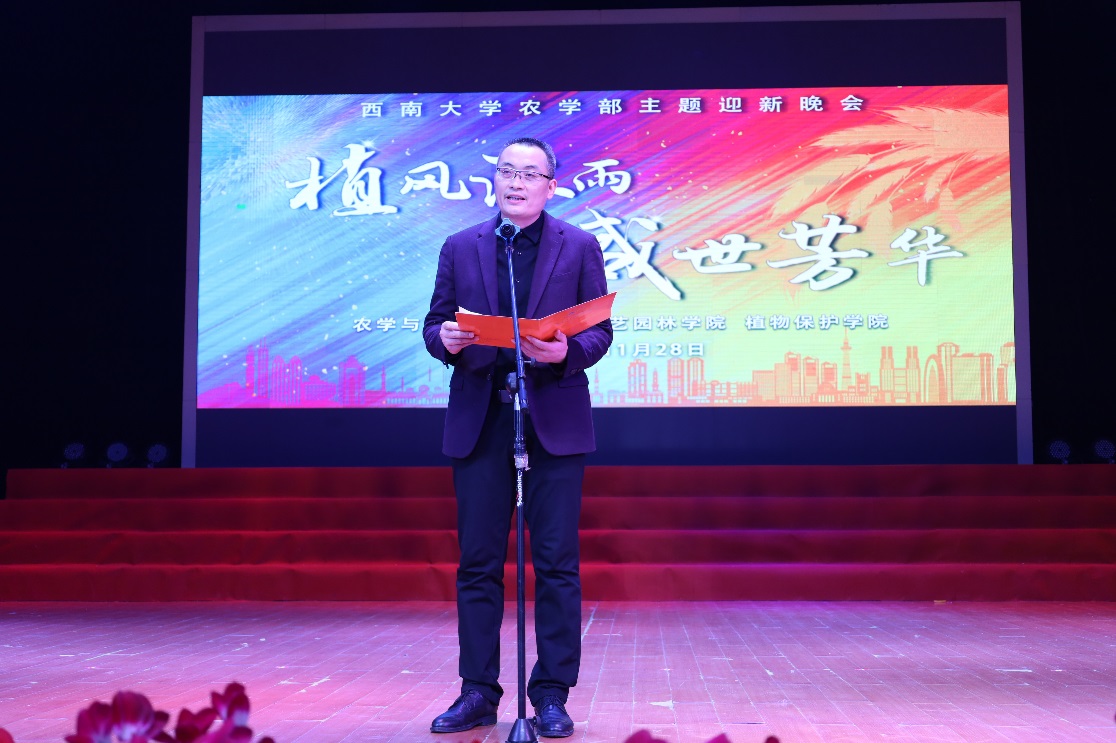 党委书记阳义健老师致辞,他向2021级农科学子提出希望:在党的百年华诞历史新起点上,农科学子要心中有理想、眼中有光芒,整装再出发,乘着时代的巨轮劈波斩浪,努力成长为经世治国的栋梁之才。
