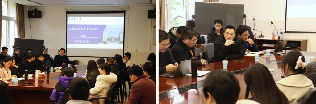会议伊始,区域系主任吕长文就农村区域发展专业的历史背景、优势特色、培养目标、课程设置、师资力量、发展前景等为大家展开详细讲解。吕长文指出,未来在乡村振兴的战略下,区域专业具有相当的优势与前景,农村区域发展专业大有可为!随后,区域系副主任袁晓辉从个人角度出发,为同学们分享了自己的工作经验和学习经验,希望同学们面对任何情况都需要提高自身的调适能力,对专业、对学习要有正确认知的逻辑起点,人生应充满正能量,更应珍惜时间,努力拼搏,学好专业,树立一个目标,立大志、立长志。
