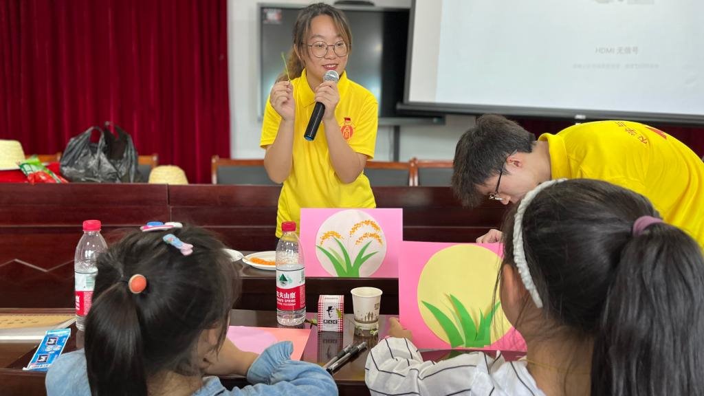 乡村教育既“扎根”,又“破土”,不仅是书本上的知识,更重要的是孩子们对未来的向往,对美好世界的追求,对外面的世界更清晰的认识。为开拓视野、增强技能、培养兴趣,实践团成员于樱桃井村开展了科学知识、安全卫生、文艺体育、劳动实践等系列小课堂,从德智体美劳全方位给乡村孩子们带来新体验。在隆平精神学习小课堂中,孩子们齐声诵读“谁知盘中餐,粒粒皆辛苦”,切实感受每一粒米饭的珍贵,一笔笔画出稻穗。“吃糖的小土豆”“变色的花朵”等趣味小实验,以生动的方式将枯燥的课本知识呈现在孩子们面前,为孩子们种下科学的种子,培养他们乐于探索的好奇心。