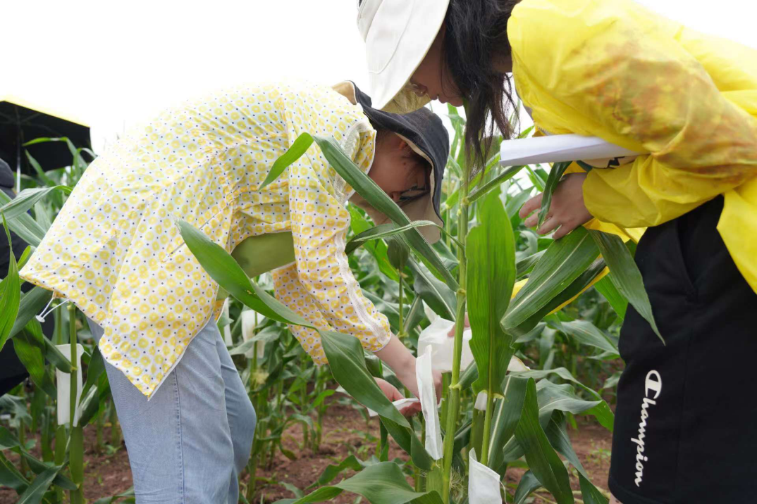 随后,全体学生分为6组,在周练、梅秀鹏和李超锋等6位研究所老师的带领下,进行“田间授粉”操作。每个组的带队老师,亲自示范了玉米田间授粉的具体操作并指导每位学生至少完成一次操作。操作结束后,每位学生“认领”了自己授粉的玉米植株,并挂上写有自己姓名等详细信息的专属铭牌。