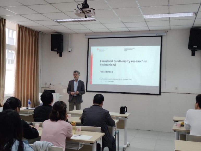 作了一场题为“瑞士农田生物多样性的研究”报告。他首先介绍了瑞士农业的发展状况和农业政策发展改革历史,并比较了中瑞农业的不同之处;其次教授介绍瑞士全域开展的农田生物多样性调查,最后介绍了他们开展的野花带工作,讲解了野花带的种植提升效果,根据他们所做的实验表明: 种植野花带可以增加了害虫天敌的数量,使谷物虫害发生率减少了61%,并发现野花带的种植效果和时间呈正相关关系。