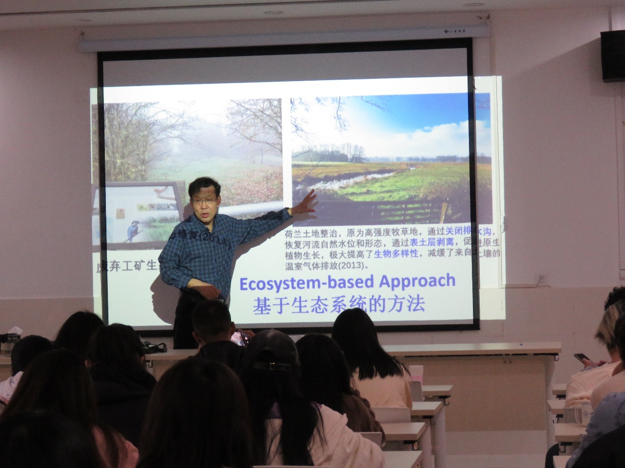 农村区域发展专业方向,基于国土空间规划的概念,讲述了国土空间生态修复的方式,并强调了牢固树立山水林田湖草是生命共同体的概念。宇教授强调我国需要构建参照生态系统,利用农业生态学原理提高生态环境的韧性和弹性,并防止千村一面的情况。为了让同学们理解“基于自然的解决方案”,宇教授举了两个例子,一个是将水泥改成海绵体等渗水砖,一个是将笔直流向的河流更改成曲线流向,这可以减少水流速度,提供更多的生存栖息空间,这也是生态廊道的构建方式,以及种植野花带为害虫天敌提供生态廊道的方式。最后,宇教授鼓励区域专业的同学们,树立一个远大的目标,积极参与其中,拥有了目标就能有更多前进的动力,将生态修复这一概念推广出去,在乡村,保证生态廊道的构建,为传粉昆虫和害虫天敌提供栖息地和食物来源,将每个乡村的独特优势打造出来,成为一个旅游资源,乡村生态价值就可以转换为实际价值。