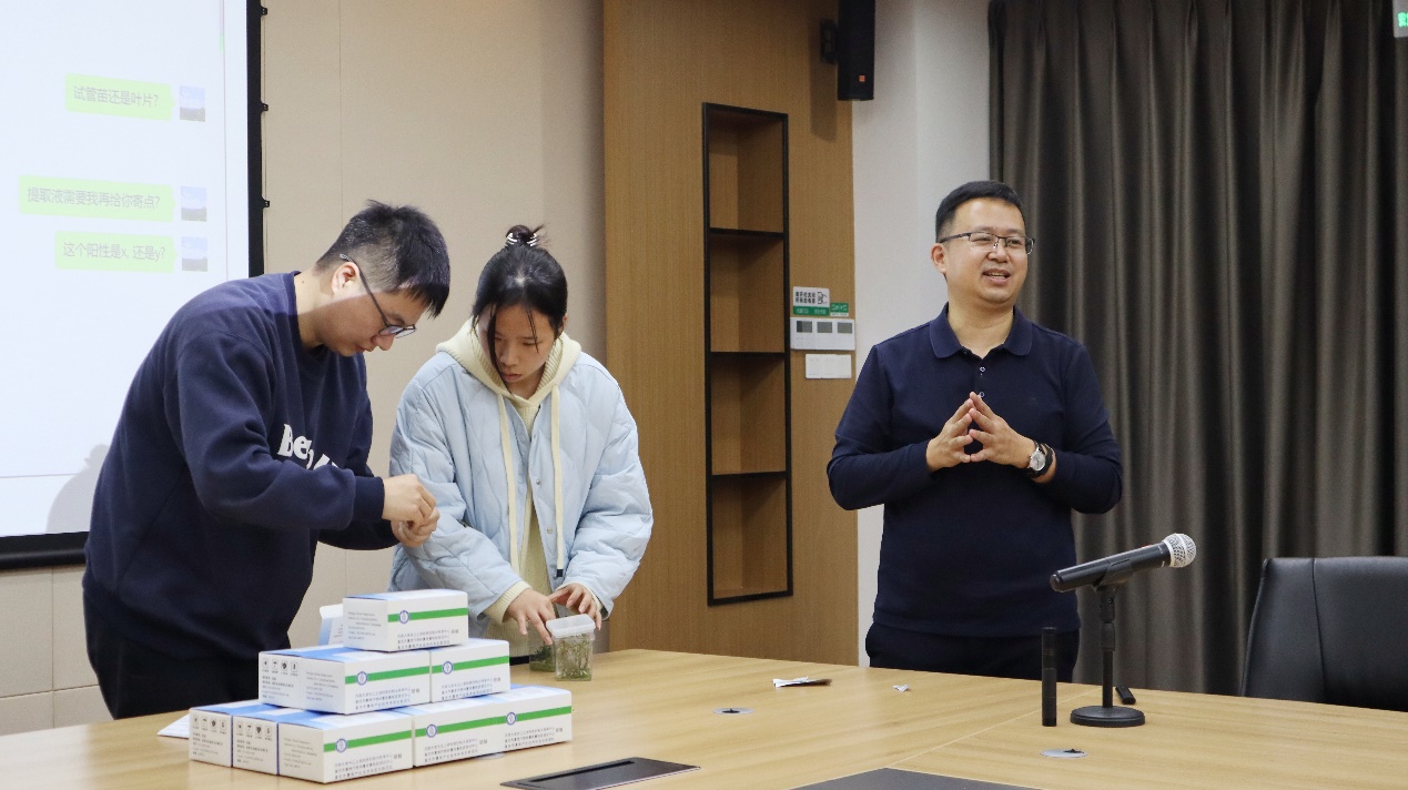 项目负责人吕典秋教授从项目的产业背景、总体情况、指标完成情况、取得成效、推广与应用、创新与优势和下一步工作计划等方面进行了详细汇报,并对试剂盒的使用方法和检测效果进行了现场演示。