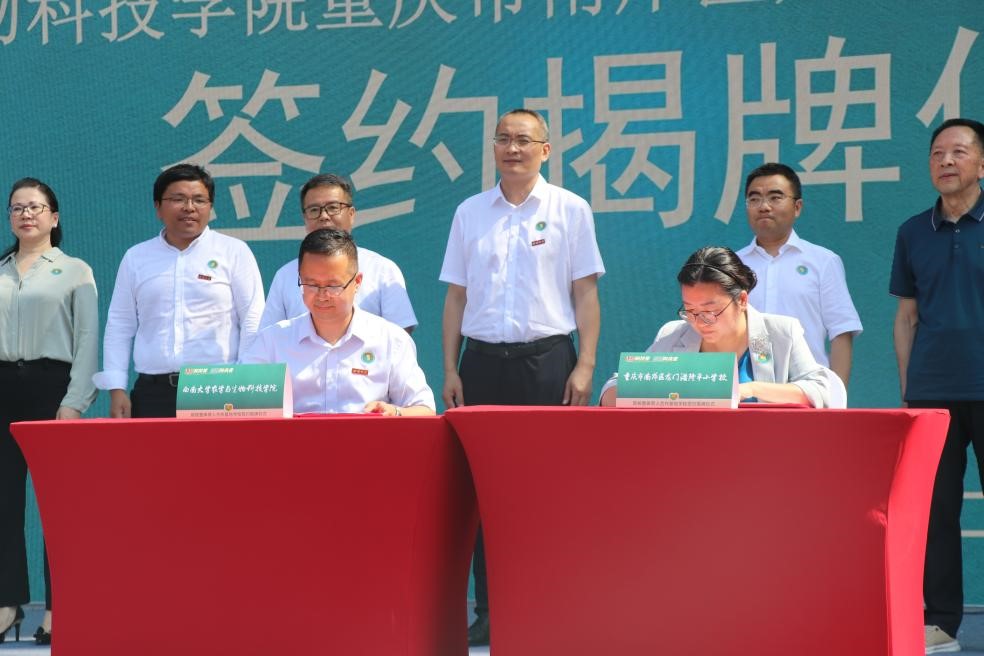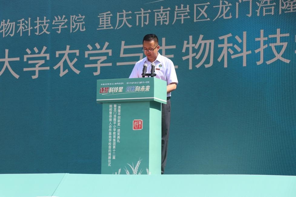 院长吕典秋在致辞中表示,两校同为袁隆平院士的母校,因袁隆平院士而有着特殊的联谊意义。两校决定在劳动教育、社会实践、科普教育、基层党建等方面开展合作,在龙门浩隆平小学设置智慧农业驻点指导基地、大学生社会实践基地、重庆市重点实验室科普教育基地等,将更加有利于两校优势互补、资源共享、共同发展。两校携手合作,大手牵小手,将汇聚起强大合力,把袁隆平的科学家精神传承好、发扬好,让其在不同年龄阶段的学生心中生根、发芽、开花、结果。