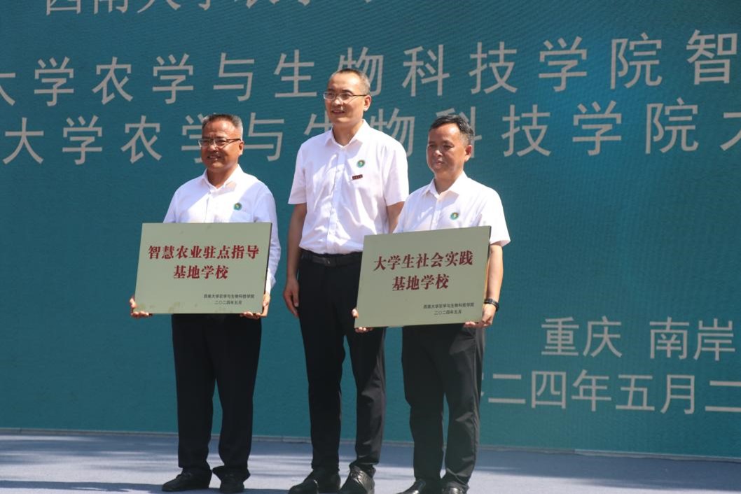 党委书记阳义健、院长吕典秋、副院长曲存民分别为“智慧农业驻点指导基地学校”“大学生社会实践基地学校”“薯类生物学与遗传育种科普教育基地学校”和“作物分子改良科普教育基地学校”揭牌。