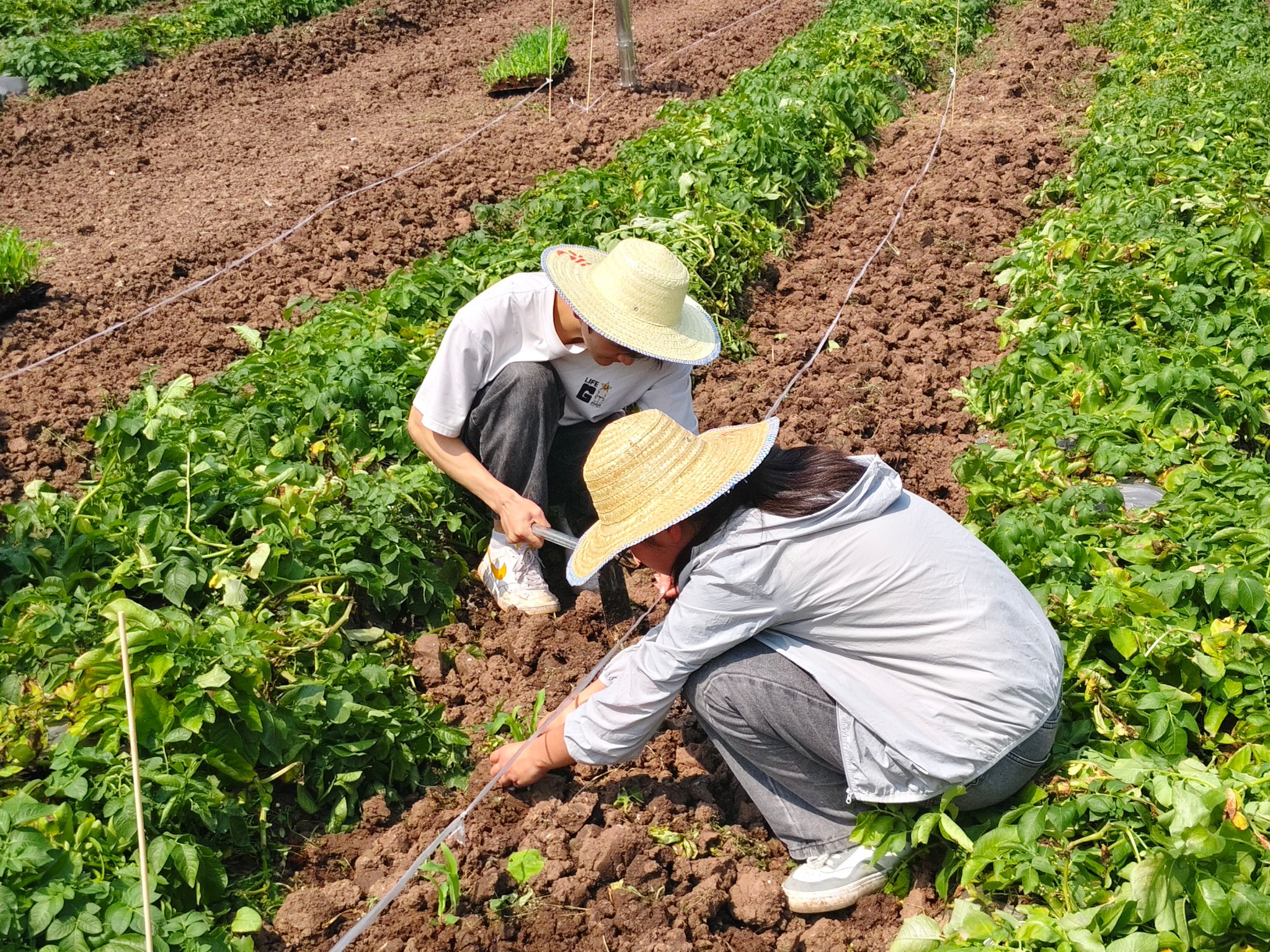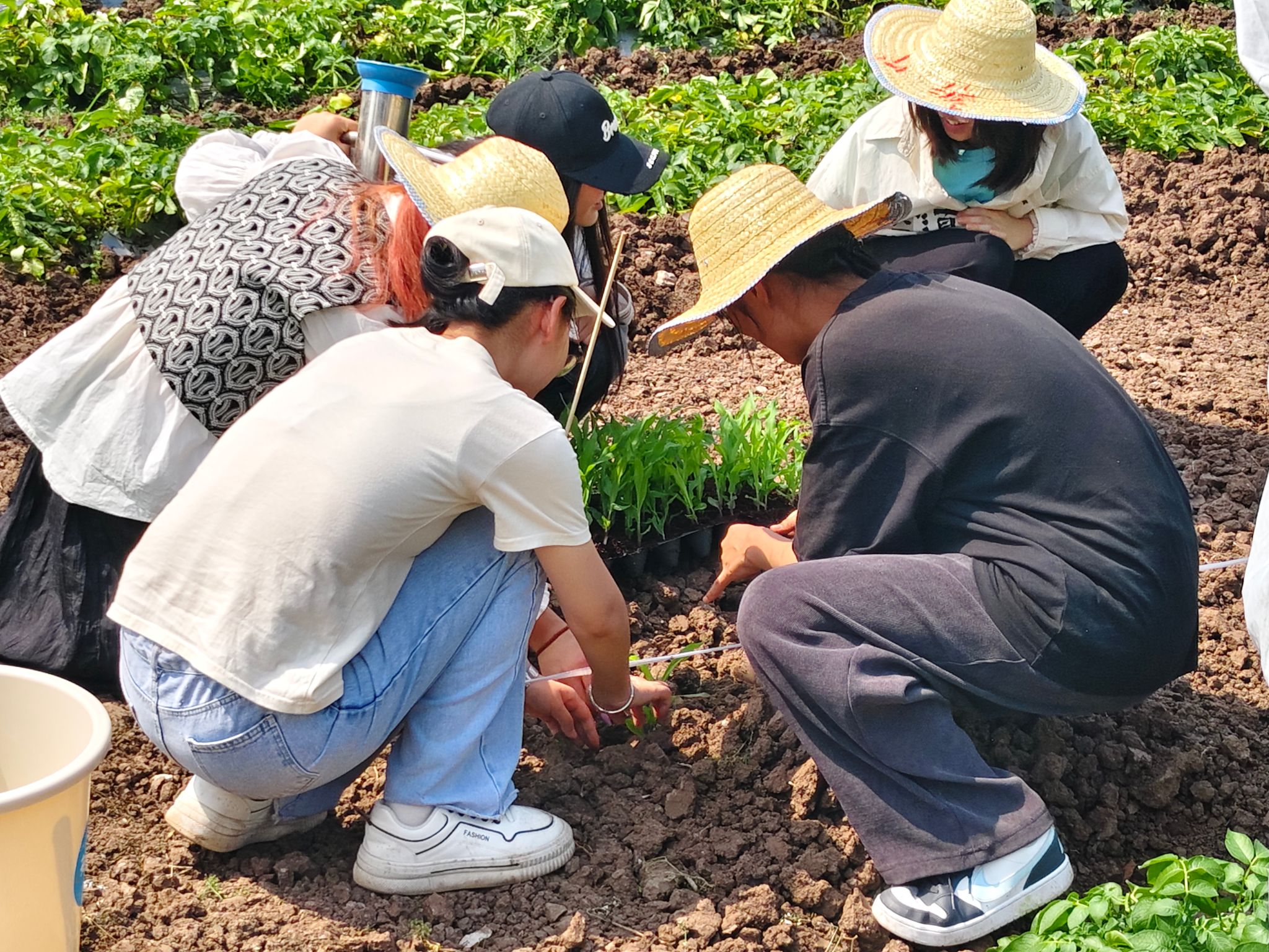 随后,同学们严格按照流程操作,开始了玉米苗移栽工作。转苗、称肥、空间配置、打窝、起苗、栽苗、施肥……大家手握锄头,躬耕田间,每一个步骤都一丝不苟,环环相扣,确保每一株玉米苗都能顺利成活。同学们分工明确,互相协作,现场一片热火朝天的景象。