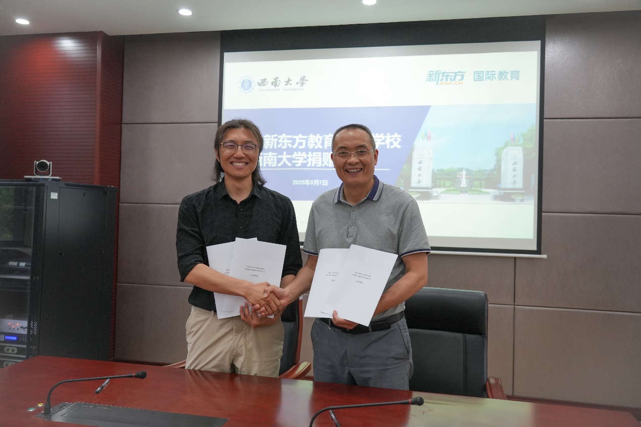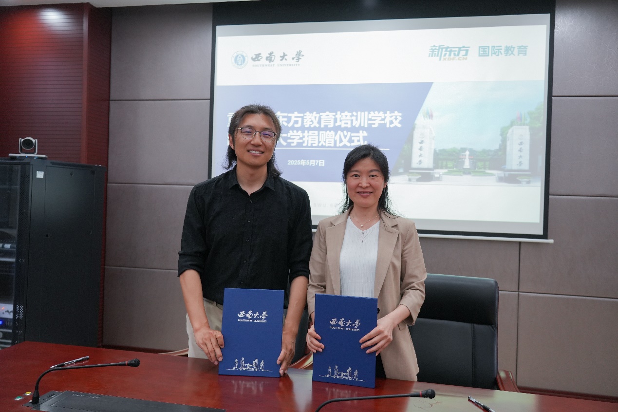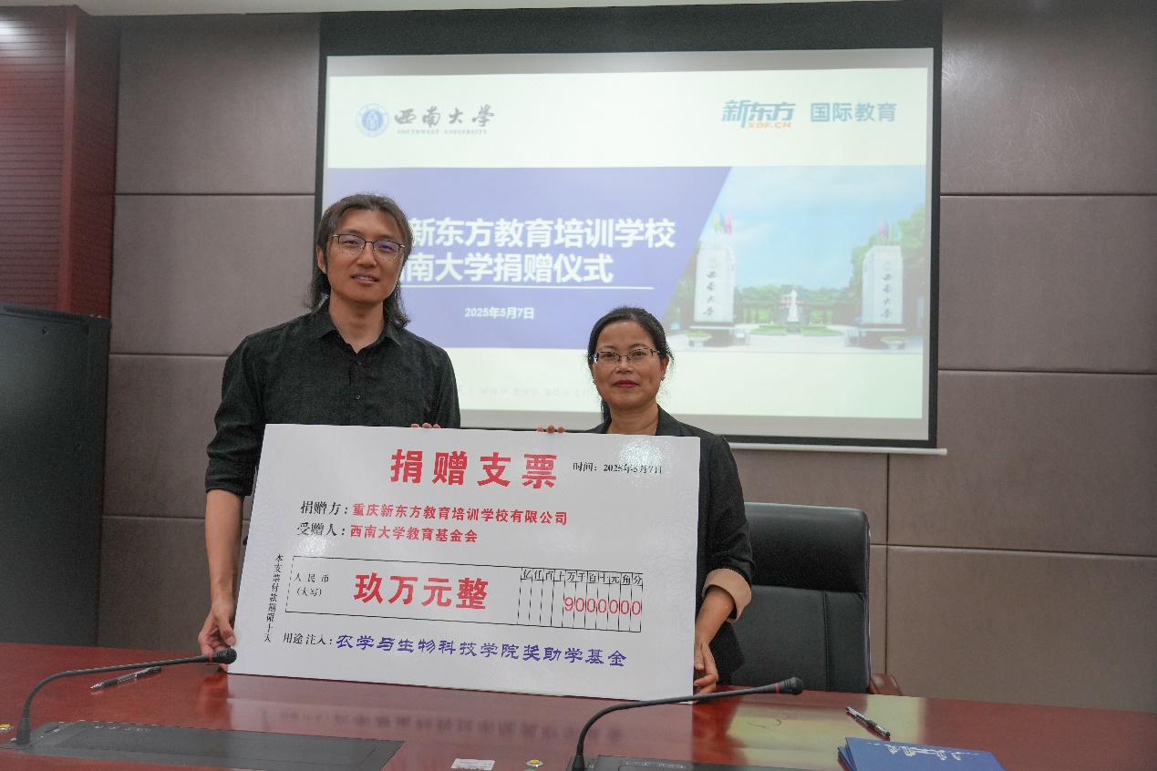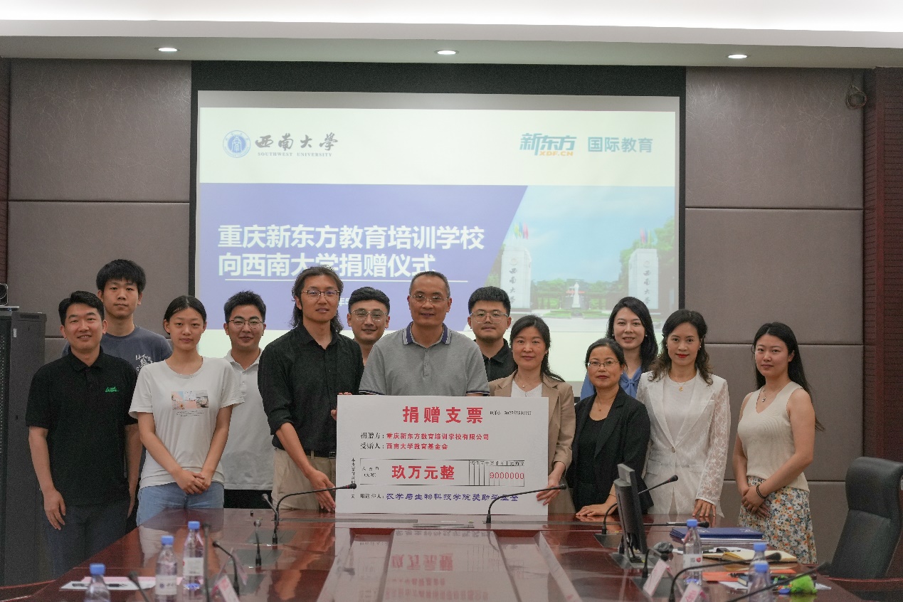 为支持农生学子赴海外深造,重庆新东方教育培训学校有限公司向学院捐赠九万元设立“国际教育奖助学金”。5月7日上午,捐赠仪式在隆平楼108会议室举行。重庆新东方教育培训学校有限公司总经理杨笑天一行,学校对外联络办公室副主任陈建英,学院党委书记阳义健、纪委书记郑莉佳、副书记刘秋艳等师生代表参加签约仪式。仪式由刘秋艳副书记主持。