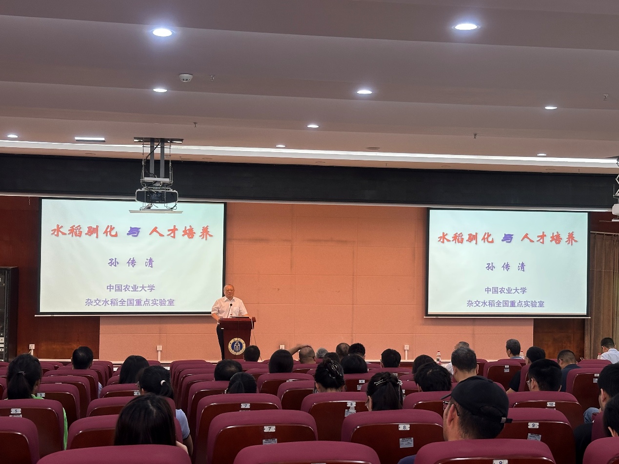 作题为《水稻驯化与人才培养》的报告。报告由学院党委书记阳义健主持,全体研究生指导教师、博士后和部分研究生参加。