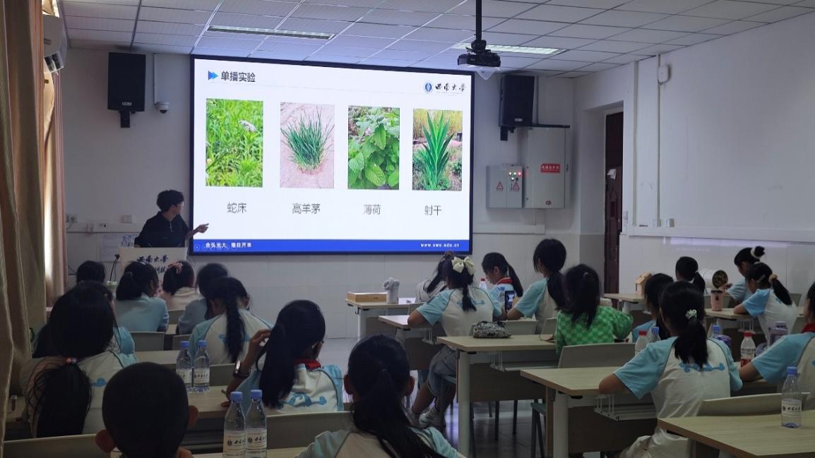 随后,段美春老师开展"生物多样性保护技术"主题讲座。他通过生物多样性现状阐述与生态学知识互动问答,生动阐释天敌和传粉昆虫对农田生态系统的关键作用,使同学们认识到开展多样性保护的重要性,增强了"生态守护者"责任意识。志愿者郑征宏为同学们讲解温室野花带适应性实验,他介绍了重庆本地常见的几种乡土植物,及该实验的主要流程,内容通俗易懂,讲解声情并茂,让小朋友们身临其境。