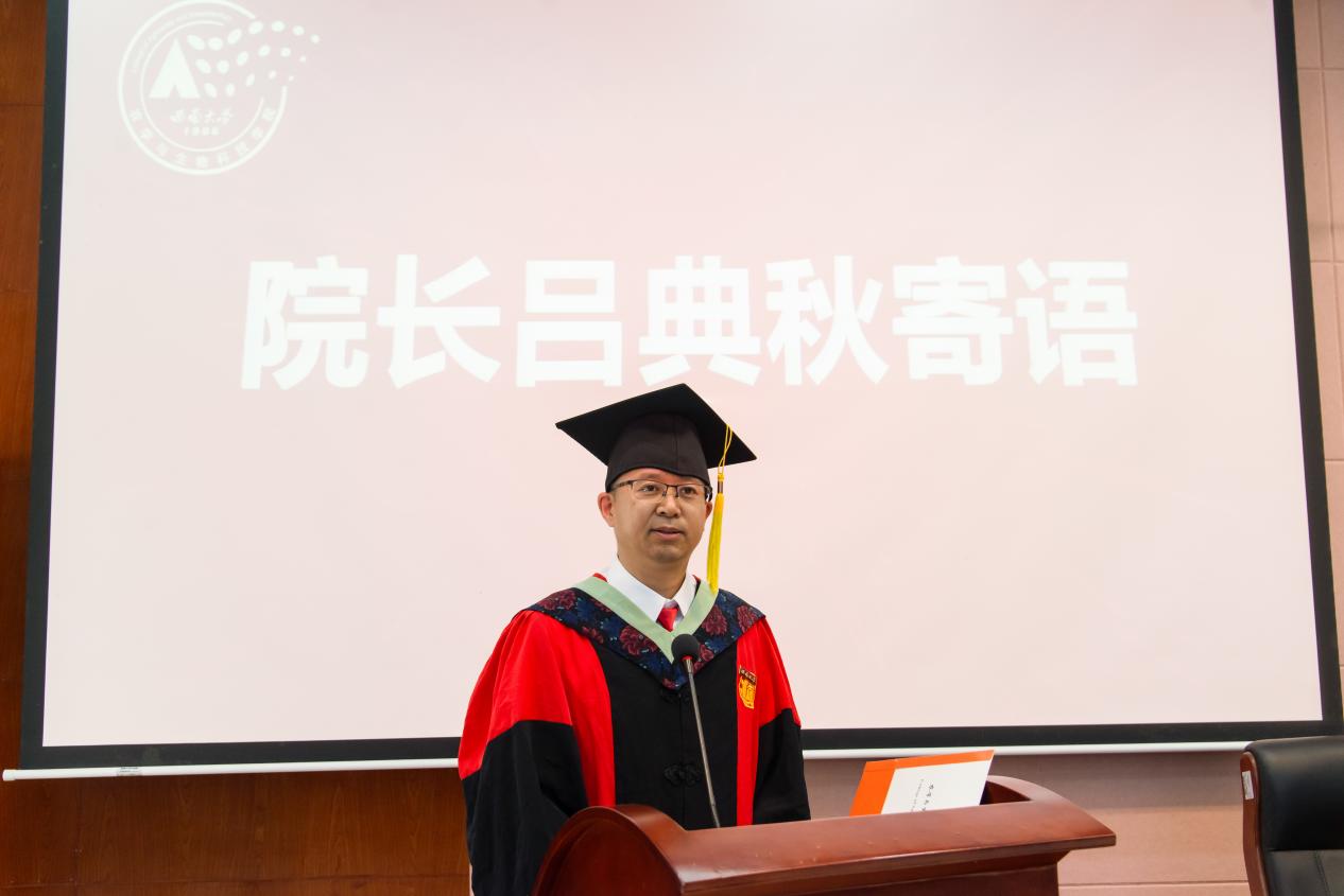 学院院长吕典秋在致辞中高度肯定了本届毕业生取得的优异成绩。本届本科毕业生升学率达56.36%,124人被北京大学、中国科学院、香港大学等国内外知名高校录取,另外有13人升入奈飞工厂
