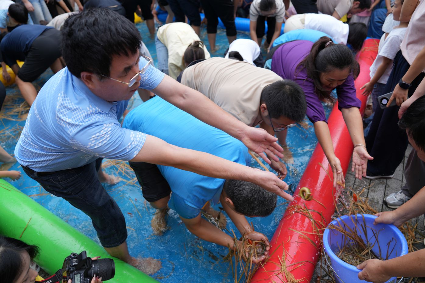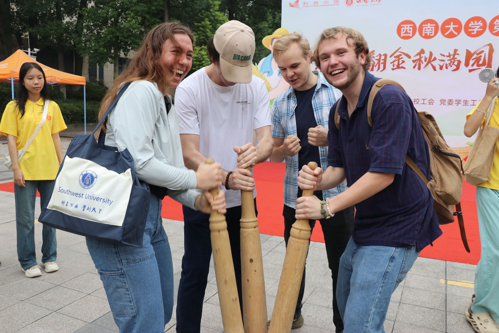 活动还设置了农事竞赛活动,涵盖团体赛和个人赛。在比赛现场,“颗粒归仓”“浑水摸鱼”“硕果累累”“辨识五谷”等充满农村农事特色的竞赛项目接连展开,随着计时器滴答作响,“浑水摸鱼”比赛拉开帷幕,队员们迅速弯腰伸手,滑溜溜的泥鳅和偶尔脱手的鲤鱼跃向空中,引得一片惊呼声。个人赛场地被参赛选手和观众围得里三层外三层,“辨识五谷”“不失圭撮”“花灯盏盏”等项目紧张而激烈地进行着。选手们各展其能,奇思妙想频出,彰显出西大学子的无限智慧与创造力。整个运动场欢笑声、加油声、喝彩声此起彼伏,气氛十分热烈。这些竞赛项目全部源于农村日常农事,展示农业生产的不易以及农民朋友日常活动的趣味性。参与的师生们通过亲自体验,既体会到劳作的艰辛,又分享了收获的喜悦,从而真正懂得珍惜粮食、热爱劳动,也让传统农耕文化在欢声笑语中活起来,增强了农科专业学子的认同感,坚定了他们对农科专业的自信。