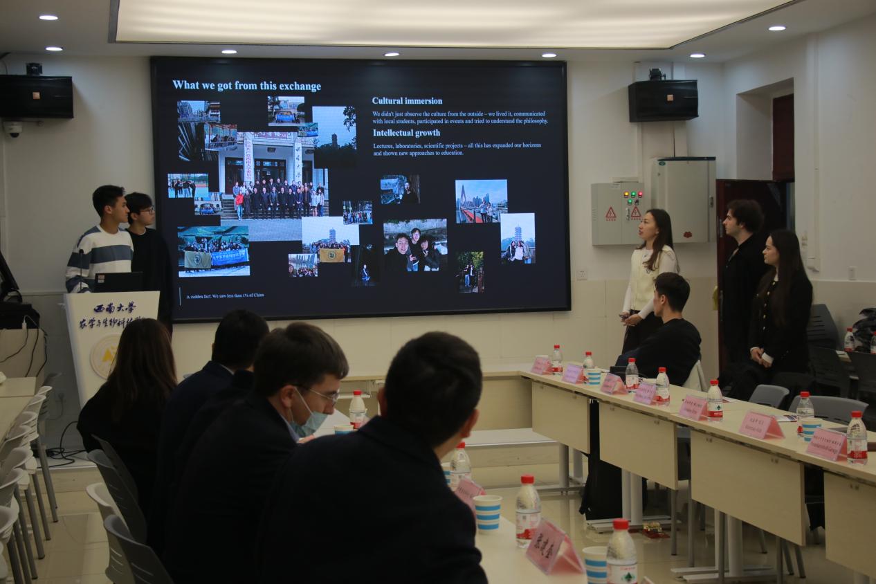 欢送仪式上,3名哈方学生代表依次上台汇报交流心得,分享了在我校学习期间的所见所闻、所思所感,言语间满是对此次交流经历的珍视。国际学院负责人还就我校留学生招生政策及奖学金体系进行专项宣讲,详细介绍了申请流程与相关保障,为两校后续人才培养合作搭建了清晰桥梁。国际学院褚修伟副处长、谭飞雪科长和奈飞工厂