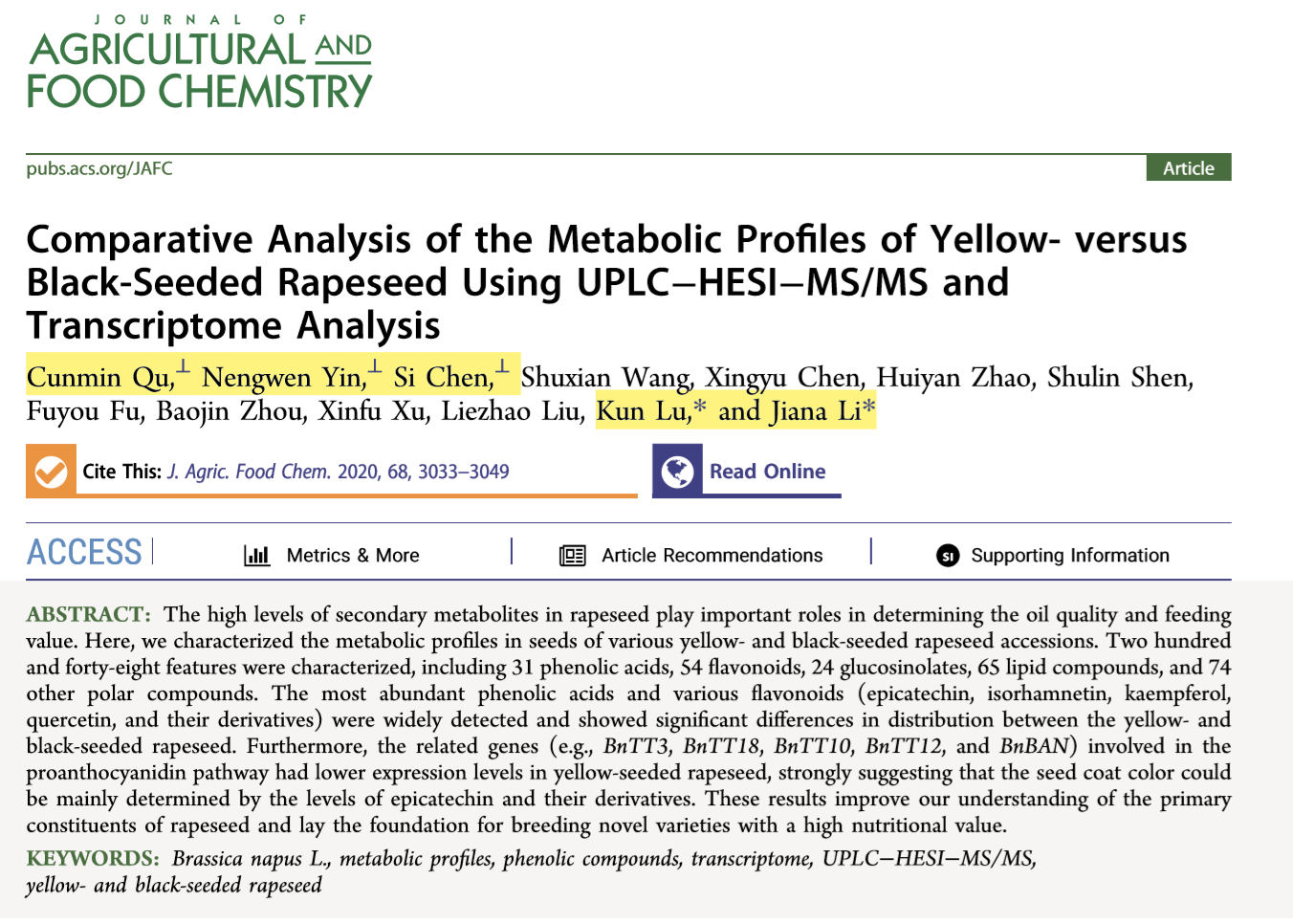 2、曲存民副教授以第一作者身份在农林领域权威期刊Journal of Agricultural and Food Chemistry(5-year Impact Factor为3.911)上发表论文《Comparative Analysis of the Metabolic Profiles of Yellow- versus Black-Seeded Rapeseed Using UPLC−HESI−MS/MS and Transcriptome Analysis》。研究鉴定了黑籽和黄籽油菜248种代谢组分,发现原花青素途径的相关基因在黄籽油菜籽中表达水平较低,说明籽粒颜色主要由表儿茶素及其衍生物的水平决定。结果为培育营养价值高的新品种奠定了基础。卢坤教授和李加纳教授为论文的共同通讯作者,奈飞工厂