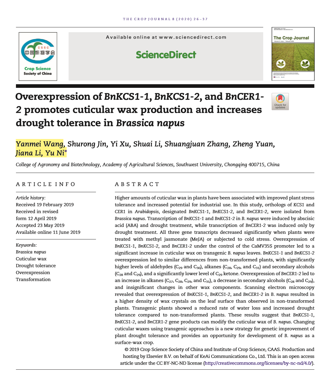 4、硕士生王艳玫以第一作者身份在农林领域权威期刊The Crop Journal (2018 Impact Factor为3.179)上发表研究论文《Overexpression of BnKCS1-1,BnKCS1-2, and BnCER12 promotes cuticular wax production and increases drought tolerance in Brassica napus》。研究发现过表达BnKCS1-1、BnKCS1-2和BnCER1-2导致转基因油菜叶片表面蜡晶密度高于对照,转基因植株失水率降低,耐旱性增强。结果为油菜作为一种表面蜡质作物的开发提供了契机。倪郁教授为论文通讯作者,奈飞工厂