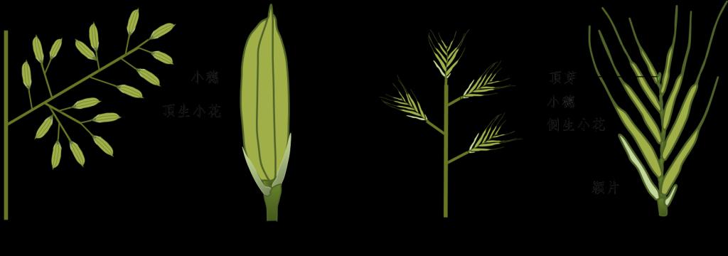 在水稻中,花序有枝梗和小穗两种类型,而小穗的花序本质不为大多数人所知。实际上小穗是禾本科特有的花序结构,由一对苞片和数目不等 (1-40) 的小花组成,在不同物种中分为确定性小穗和不确定性小穗两类,在确定性小穗物种如水稻、玉米中,小穗分生组织在产生一定数目的侧翼花分生组织后,其顶端分生组织最终会转化为顶花分生组织,从而终止小穗分生组织的命运,这类小穗只能产生固定数目的小花/籽粒。相反,在不确定性小穗物种中,比如小麦、二穗短柄草等,小穗分生组织命运一直维持以产生数目不定的侧翼花分生组织,这类小穗最终产生的小花/籽粒数目是变化的,且一般都大于2个 (图1)。理论上,如果能够将水稻确定性小穗定向转化为不确定性小穗,将实现“小穗内小花/籽粒数目”的倍增。
