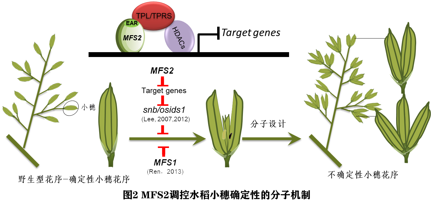 已有研究表明,三个水稻AP2-like基因SNB、 OsIDS1和MFS1参与了小穗分生组织确定性的调控,突变后发生一定比例的小穗内多小花情况。其中MFS1是该课题组鉴定并于2013年发表在Plant Physiology上。在近日发表的这篇文章中,研究人员发现MFS2编码一个MYB转录因子,具有明显的转录抑制活性,可以通过EAR基序和转录共抑制子TPRs结合,从而介导组蛋白修饰抑制下游基因,最终影响了SNB和OsIDS1基因的表达,从而在小穗分生组织确定性调控中发挥作用(图2)。