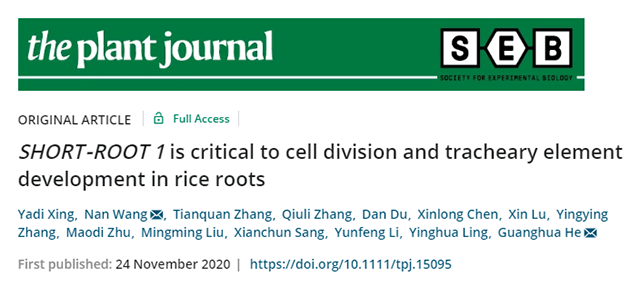 水稻课题组在The Plant Journal上发表题为SHORT‐ROOT 1 is critical to cell division and tracheary element development in rice roots的研究论文,解析了水稻短根基因SR1调控根发育的分子机制。