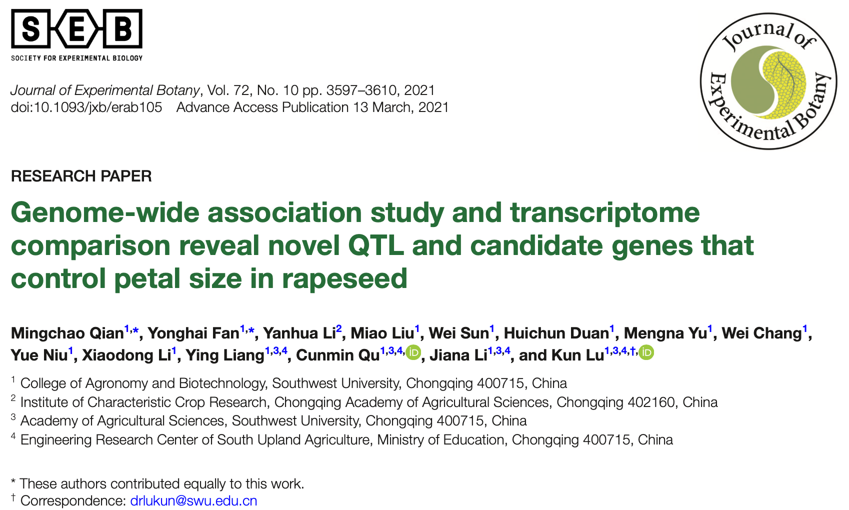 博士生钱明超在《Journal of Experimental Botany》(IF2020 = 5.908)上发表题为《Genome-wide association study and transcriptome comparison reveal novel QTL and candidate genes that control petal size in rapeseed》的研究论文,揭示了两种可能决定油菜花瓣大小的调控通路: BnaA05.RAP2.2可能通过乙烯信号途径抑制细胞周期相关基因表达,导致花瓣变小;细胞分裂素信号转导途径的ARR4通过调节细胞周期相关基因促进花瓣变大。研究为理解植物花瓣发育的分子遗传机制奠定了基础。
