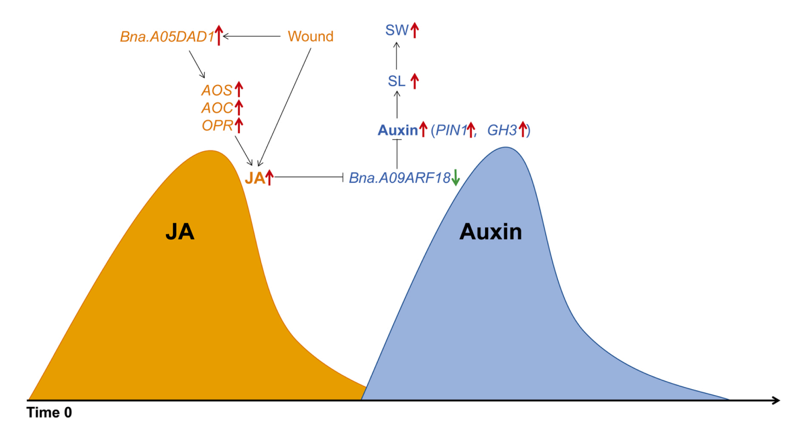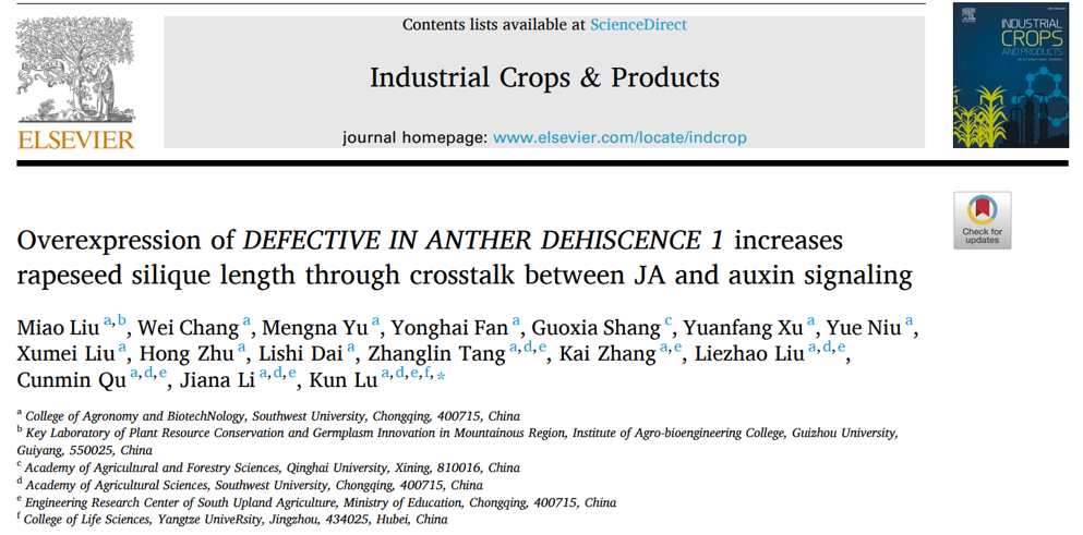毕业博士生刘淼在《Industrial Crops & Products》(IF2020 = 4.244)上发表题为《Overexpression of DEFECTIVE IN ANTHER DEHISCENCE 1 increases rapeseed silique length through crosstalk between JA and auxin signaling》的论文。研究鉴定出一个与油菜花药开裂缺陷相关基因Bna.A05DAD1。在拟南芥和甘蓝型油菜中过表达该基因能促进细胞变大,以增加角果长度、粒重,提升单株产量。过表达Bna.A05DAD1通过激活茉莉酸合成途径基因(AOC4;BnaA02AOS和Bna.C03OPR),以抑制角果发育负调控基因Bna.A09ARF18的表达,然后,激活生长素应答基因,促进生长素合成,实现产量提升。研究揭示了茉莉酸与生长素信号通路交互作用控制油菜产量性状的新机制。