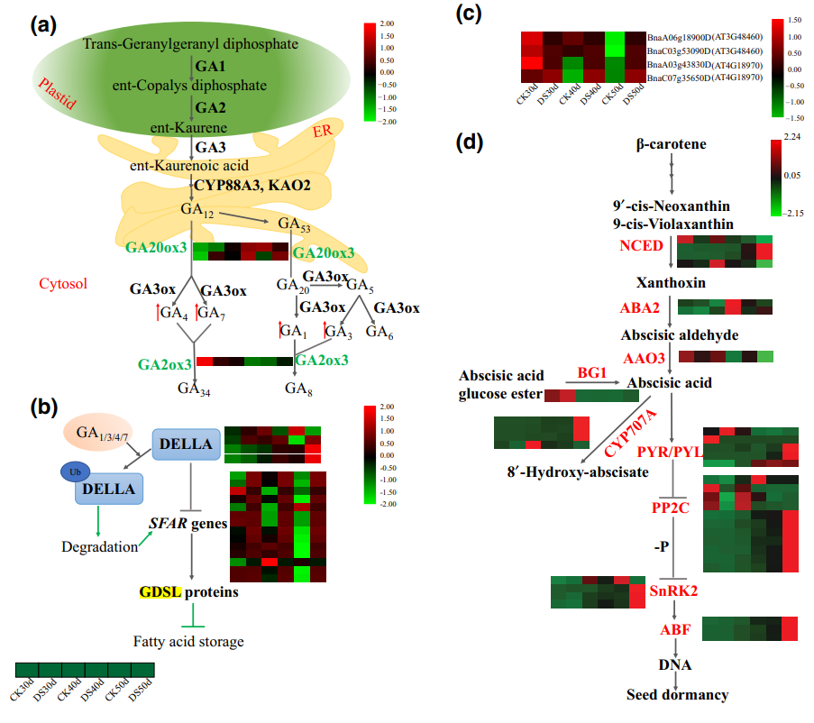 博士生李阳阳在《GCB-Bioenergy》(IF2020 = 5.316)上发表题为《Transcriptome and proteome analyses of the molecular mechanisms underlying changes in oil storage under drought stress in Brassica napus L.》的论文,揭示了干旱胁迫导致种子发育过程中含油量降低,蛋白质含量增加;脂肪酸生物合成过程中基因和蛋白质表达降低,而脂肪酸降解和蛋白质储存过程中基因和蛋白质表达增加。干旱胁迫下增加GA含量可促进GDSL基因表达,导致脂肪酸含量的降低。长期干旱胁迫后籽粒中ABA合成增加和信号转导增强可能与籽粒含油量的变化有关。研究结果揭示了干旱胁迫下甘蓝型油菜种子含油量下降的分子机制,为甘蓝型油菜新品种的选育提供了理论依据。