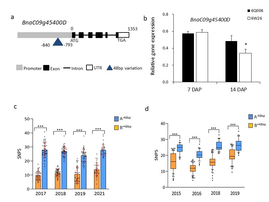 该团队在The Crop Journal在线发表题为“Identification of a candidate QTG for seed number per silique by integrating QTL mapping and RNA-seq in Brassica napus L.”的研究论文中,发现受精后14天的种子败育是一份粒数达40粒和一份粒数仅10粒的种质资源每角果粒数差异形成的原因。利用两亲本衍生而来的DH群体进行QTL检测,在C09染色体检测到一个主效位点qSNPS.C09,可解释28.77%~60.64%的表型变异。通过BSA分析和转录组分析,在qSNPS.C09区间内挖掘到一个差异表达基因BnaC09g45400D(BnaC09.APT5)。该基因启动子区48 bp的插入序列,导致该基因在多粒和少粒材料授粉后14 天的角果中差异表达,并引起每角果粒数的不同。转录组分析结果表明,该基因可能通过细胞分裂素相关的代谢途径调控每角果粒数。该研究不仅加深了我们对油菜每角果粒数调控分子机理的理解,而且为油菜高产育种提供了新的目标基因。