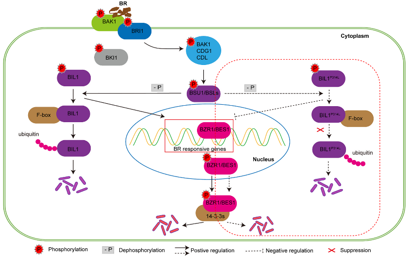 图3 BIL1在油菜中抑制油菜素内酯信号传导作用的模型,P314L替换抑制BnaC04.BIL1蛋白降解,阻断BES1/BZR1蛋白释放。全文链接//doi.org/10.1016/j.indcrop.2024.118066.