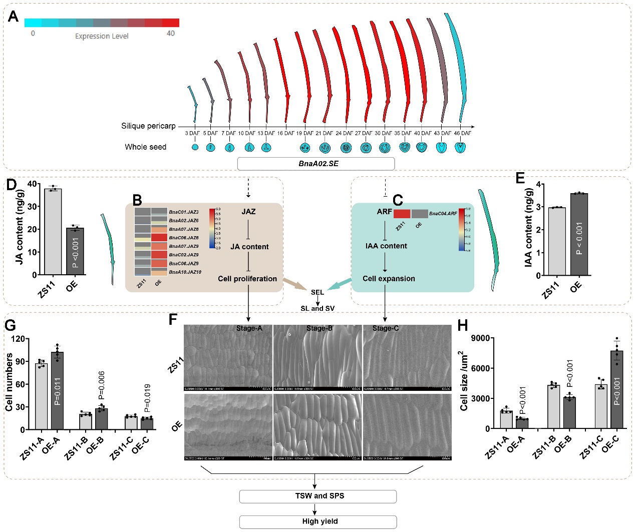 油菜生物学创新团队题为“Integrating GWAS, RNA-Seq and functional analysis revealed that BnaA02.SE mediates silique elongation by affecting cell proliferation and expansion in Brassica napus”的最新研究成果。该研究通过对588份甘蓝型油菜自然群体材料的角果动态伸长长度进行GWAS分析,进一步通过极端材料转录组的测序分析结果,鉴定了一个位于A02染色体上的未知功能基因。结合转基因材料的动态细胞学观察、转录组数据分析和理化指标的检测,发现BnaA02.SE可通过调控JA和IAA含量分别影响角果皮细胞的分裂和扩增进而促进角果的快速伸长。角果形态的较早建成更有利于增大角果皮的光合面积而促进光合同化产物向籽粒转运形成较高的千粒重,同时较长的角果可提供充足的空间以提高每角粒数。综上,该研究为油菜角果的动态发育提供了全新的见解,同时在油菜中克隆了第一个调控角果动态发育的未知功能基因并解析了其调控机制。