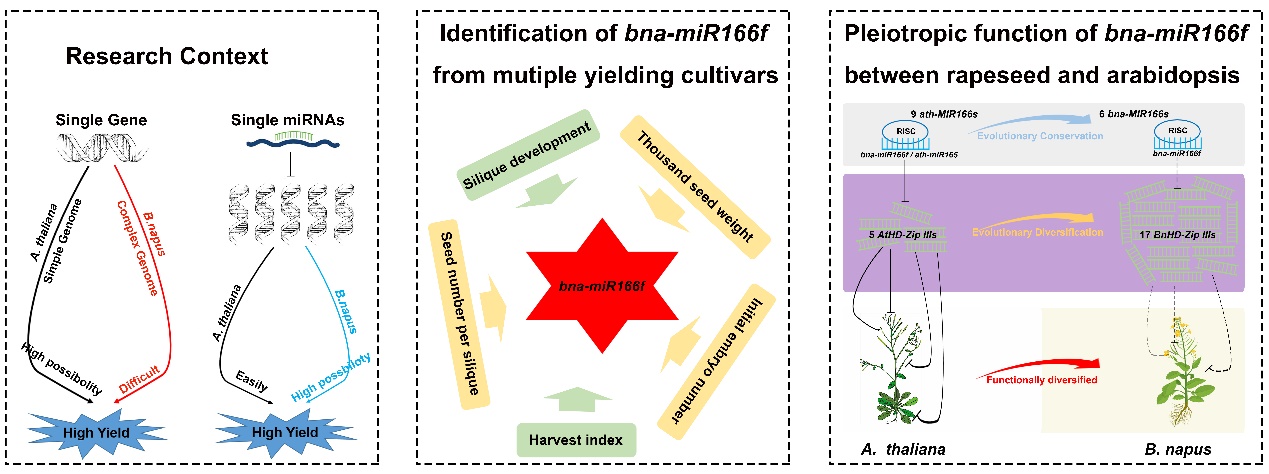 油菜生物学创新团队题为“Comprehensive high-throughput sequencing, evolutionary and functional analyses reveal the conservation and diversification of miR166s in regulating pleiotropic traits between rapeseed and Arabidopsis”的最新研究成果。该研究通过对油菜角果长度和收获指数等产量极端材料进行高通量测序分析,鉴定到一个在调控油菜产量方面具有多效性的功能因子bna-miR166f。进一步通过在拟南芥中异源干扰表达和超量表达bna-miR166f的转基因实验,揭示了bna-miR166f通过介导拟南芥中全部5个HD-Zip III靶基因的表达而调控开花时间、角果及侧枝发育等多个产量相关性状。但多个油菜产量材料的miRNA-Seq数据显示bna-miR166f在调控拟南芥与油菜生长发育方面表现出部分相反的表型。通过全基因组进化及大量miRNA/mRNA-Seq数据分析结果,发现拟南芥和油菜之间的部分功能差异可能是由于靶基因在进化过程中形成的功能分化以及bna-miR166f和17个BnaHD-Zip IIIs靶基因间靶向关系的时空选择特性所造成的。综上所述,这些结果揭示了bna-miR166f在产量等多效性状遗传调控中的关键作用,并为miRNA在未来油菜高产分子育种中的应用提供了理论依据。
