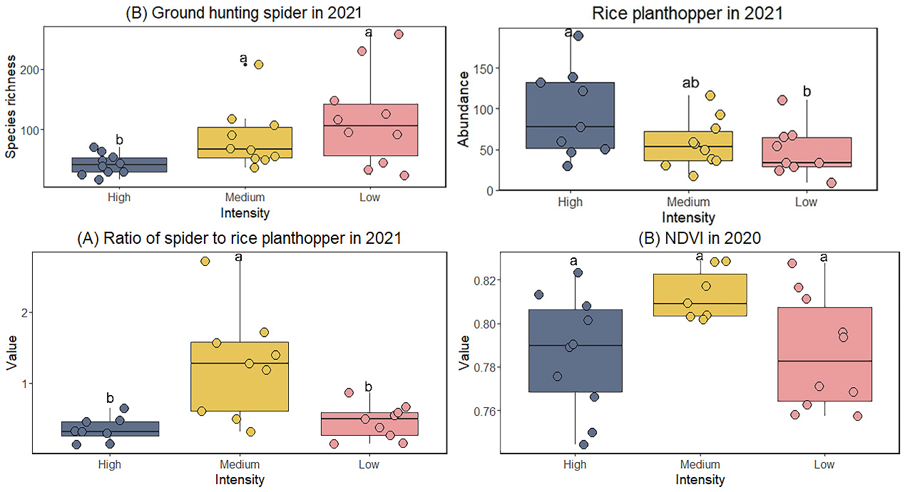 研究结果表明,高强度土地整理后林地、荒草地等半自然生境地的比例显著下降(从8.9%到4.4%),而田块大小均值显著增加(从1.4亩到4.2亩),蜘蛛多样性下降,稻飞虱增多,稻田生态系统的生物防治功能减弱。但在保留原有半自然生境和整体景观格局的基础上仅进行适度田块合并的中等强度土整整理,和未进行土地整理的景观生物多样性和稻田NDVI值(用以评估水稻产量)差异不大。由于单个田块面积的增加有利于提高机械耕作效率,因此中等强度土地整理是协调稻田景观生物多样性保护与机械化生产效率的最佳策略。
