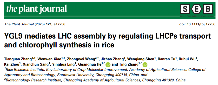 水稻团队在 The Plant Journal上发表了题为《YGL9 mediates LHC assembly by regulating LHCPs transport and chlorophyll synthesis in rice》的研究论文,解析水稻LHC组装的分子机制。