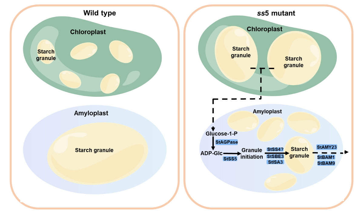该研究发现马铃薯非典型的淀粉合成酶V(StSS5)在叶片和块茎的淀粉颗粒起始中具有重要的功能,调节块茎发育和淀粉积累。一方面,ss5突变体导致叶片叶绿体中淀粉颗粒变少而大,这可能降低了淀粉降解速率,增加了夜间的呼吸速率,导致块茎分配碳源不足。另一方面,ss5突变导致块茎淀粉质体中复合淀粉粒的形成,可能减小了淀粉颗粒大小,改变淀粉理化特性。这种淀粉颗粒起始的改变重编程了块茎中的淀粉代谢途径,调节了块茎的发育和淀粉积累。综上所述,ss5突变体块茎中淀粉合成代谢途径的重编程和从叶片到块茎的碳源分配减少可能影响块茎发育和淀粉积累。研究结果为理解块茎淀粉颗粒的起始形成提供了新的见解,并为改良马铃薯块茎发育和淀粉特性开辟了一种潜在的策略。