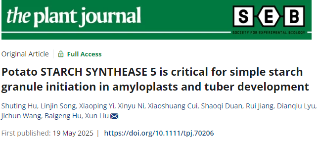 薯类团队在植物学TOP期刊The Plant Journal上在线发表了题为“Potato STARCH SYNTHASE 5 is critical for simple starch granule initiation in amyloplasts and tuber development”的研究论文。