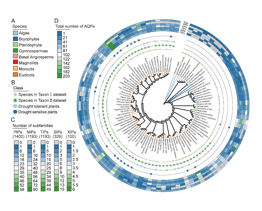 水通道蛋白(AQP)是促进水分运输并显着促进植物在干旱胁迫下的适应的整体膜通道蛋白。然而,该基因家族的进化起源和功能多样性机制仍有待阐明。该研究使用了两个数据集:Taxon I(藻类到真双子叶植物)和Taxon II(被子植物,包括耐旱和干旱敏感植物)。通过系统分析两个数据集的基因结构、密码子偏好、基序和顺式元件,揭示了AQPs基因在植物适应进化和耐旱进化中的分子机制。系统发育分析结果表明,AQP基因家族分为5个主要亚家族:PIPs、NIPs、TIPs、SIPs和XIPs。通过对各亚科进化特征的深入分析,发现不同亚群的出现和消失与特定物种的生态适应需求有关。通过系统分析PIPs和TIPs亚家族和亚簇成员的进化历史,并结合其基因表达模式,证实PIP2、TIP1和TIP4亚簇成员在干旱胁迫下表现出更显著的表达响应特征。