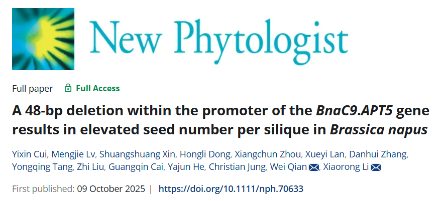 油菜资源团队在New Phytologist 上发表了题为 “A 48-bp deletion within the promoter of the BnaC9.APT5 gene results in elevated seed number per silique in Brassica napus”的研究论文。该研究系统揭示了一个腺嘌呤磷酸核糖转移酶基因BnaC9.APT5,通过促进细胞分裂素合成,进而参与调控油菜每角果粒数的分子机制。该研究不仅为油菜每角果粒数调控分子机理提供了新的见解,也为油菜高产分子育种提供新的靶标。