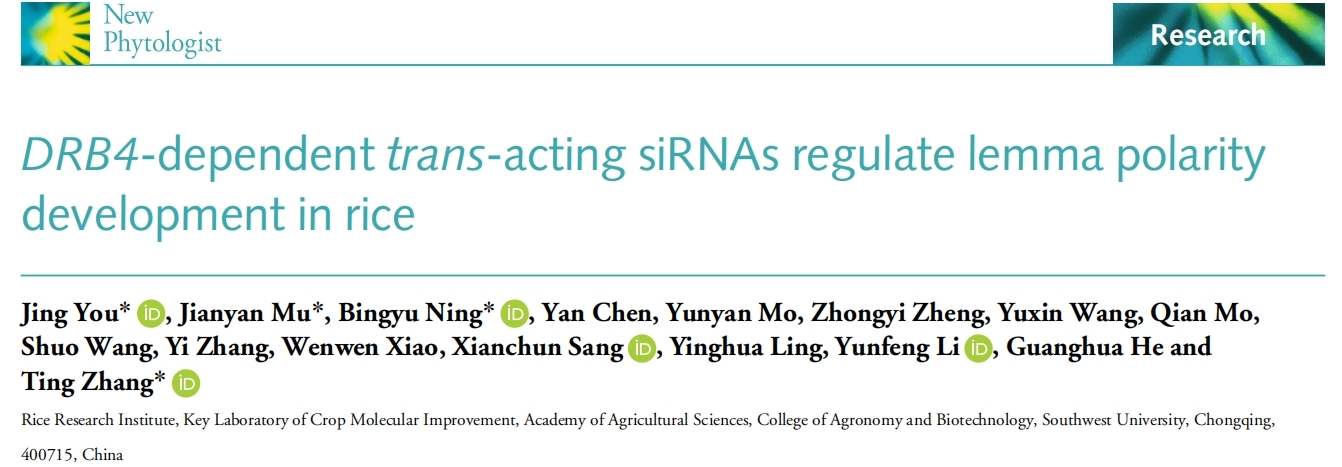 水稻研究所在《New Phytologist》在线发表题为“DRB4-dependent trans-acting siRNAs regulate lemma polarity development in Rice”的研究论文,揭示了一条由DRB4介导的小RNA调控通路在水稻外稃极性建成中的关键作用,为解析水稻花器官形态建成机制及分子设计育种提供了新的理论依据。