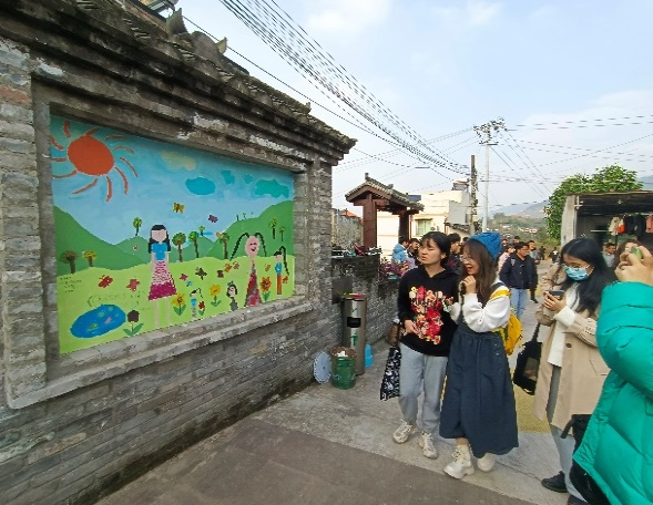 随后,杜书记带领师生们入村参观,切身体会东升浓厚的艺术氛围。走在乡野村道上,道路两旁香柳相映,房屋瓦舍色彩明亮又不失整齐有序,多样的图画、柔美的线条配合靓丽的自然色形成一幅风景画,帧帧入目。建设者们以群众为主体,充分考虑村民的意愿和利益,提高村民参与度。墙面上有许多图画是艺术家将村中儿童的原创画作等比例放大摹刻而成的,既富有创造性又充满原生态,增强村民的归属感和凝聚力。杜书记提到目前东升的工作重点在于引导村民有序自治,村委坚持与人民群众紧密联系的原则,村中设置“传声筒+回音壁”,鼓励村民积极提出意见建议,条条有回应,村务公开透明,践行“全心全意为人民服务”的宗旨,保障村民权利的实现。