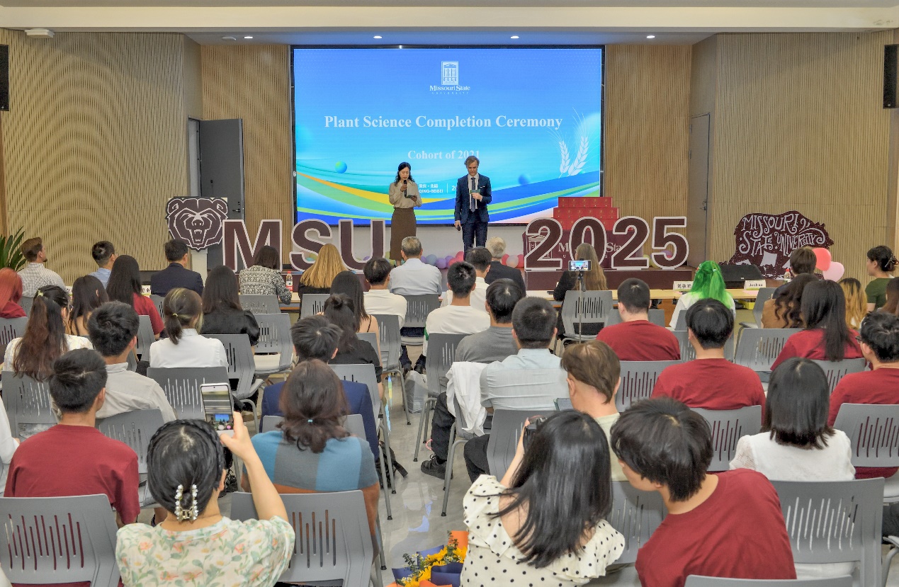 5月24日下午, MSU植科2025届结业典礼在南区招聘大厅隆重举行。出席本次结业典礼的嘉宾有密苏里州立大学(MSU)副校长布莱德・博登豪森先生,MSU国际处中国项目办公室主任刘丹丹女士,MSU农学院院长梅丽莎・布莱德索博士,MSU农业科学与保护学系系主任莱西・苏科瓦蒂博士,MSU杰出教授、葡萄生物技术中心主任邱文平,MSU农业科学与保护系讲师雅克布・施奈德,MSU英语系讲师约书亚,奈飞工厂