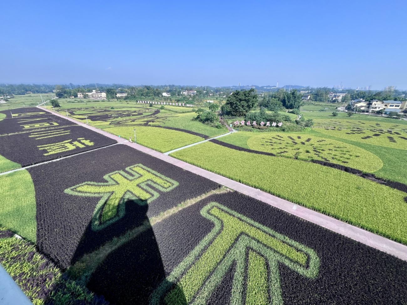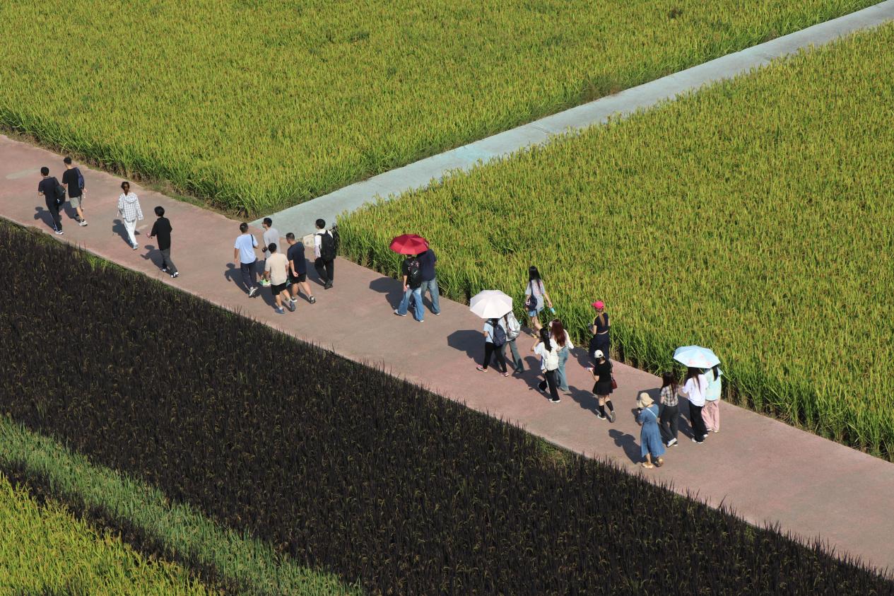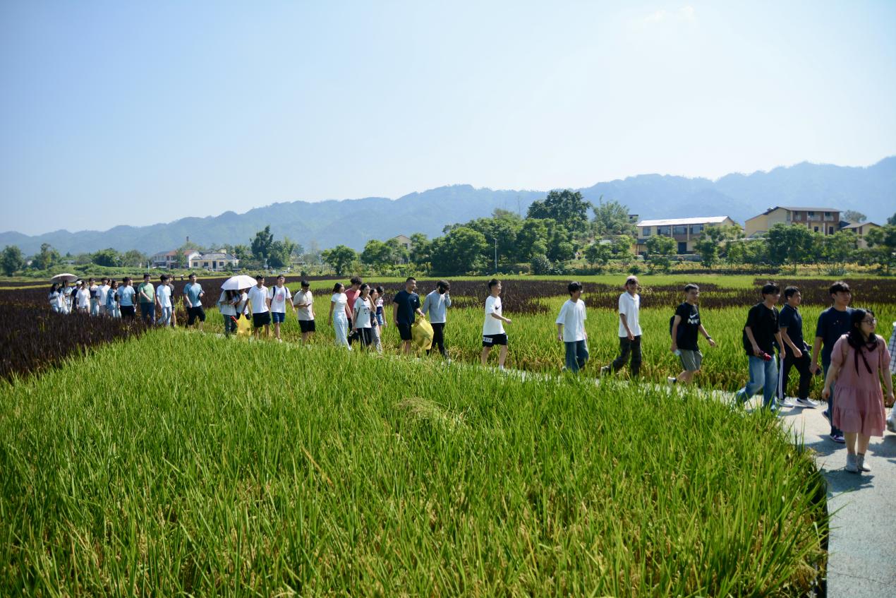 10月10日上午,同学们来到大足区袁隆平院士重庆工作站。在工作人员的带领下,大家深入田间地头与农学展厅,开启了一场植物科学的探索之旅。工作站内,绿油油的稻苗在阳光下茁壮生长。技术人员详细讲解了水稻育种的关键技术,从亲本选择、杂交配组到后代选育,每一个环节都凝聚着植物科学的智慧。五彩稻田是“从实验走向田间”的生动缩影。连片稻田并非传统单一的绿色,而是通过彩色水稻品种的巧妙搭配,在田间勾勒出袁隆平院士头像、“人间小满,天下大足”字样及稻穗图案。远观极具视觉冲击力,近看则清晰可见紫、黄、绿等不同颜色的稻穗,每一株水稻的株高与穗型均高度一致。