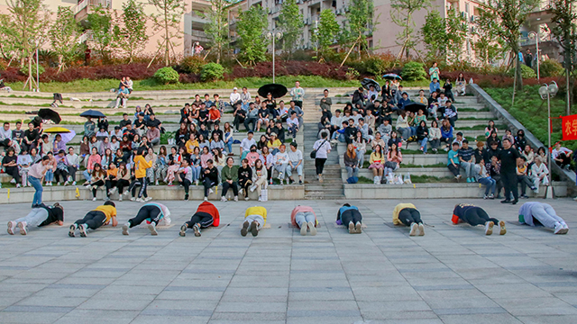 在团队项目结束后,还进行了女生平板支撑、男生俯卧撑与背靠背深蹲三项个人项目。学院素有“第二体院”的誉称,同学们更是卧虎藏龙,将比赛变成了个人能力秀,让在场师生观众惊叹不已,大加赞赏。这三个项目,不仅是个人素质的比拼,更是对毅力的考验,特别是平板支撑坚持到最后的两位女生,充分展示了永不放弃、永不气馁、永不低头的体育精神,就算牙齿紧咬、双腿颤抖,始终不愿意放弃,使比赛僵持了长达八分钟之久,让在场的所有人为她们紧张,也为她们喝彩。