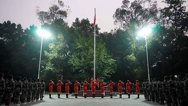 女子国旗班完成。七时许,旗手就位,出旗、升旗,伴随着嘹亮庄重的国歌声,五星红旗在晨光中冉冉升起,缓缓至顶。全体师生唱国歌、行注目礼,表达对祖国的深爱,对国旗致以最崇高的敬意。
