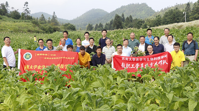 “科技扶贫”师生服务团在院党委书记赵子华、院长何光华带领下,赴国家扶贫工作重点县--重庆市彭水苗族土家族自治县开展农业科技下乡活动,将先进农业科技运用到实际生产,助力彭水的农业生产和农民致富。实践团由院长何光华领衔,由专家教授13人和学生6名组成,其中含博士生导师5人,研究领域覆盖水稻、油菜、棉花、烟草、小麦、玉米、薯类等多种作物,学生包括博士研究生1名和本科生5名。通过召开农业科技座谈会,与彭水县农业技术推广中心、彭水县烟草公司相关领导就基层农业发展问题进行探讨和交流,并实地考察烟草种植基地,就基地实际生产情况提供技术指导。