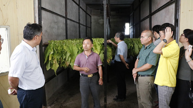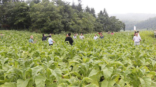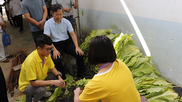 14日上午,实践团的师生与烟草种植基地工作人员一同前往彭水烟草种植基地考察,了解基地当前的种植模式、种植存在的问题以及产业流程,参观了基地烟叶烤房、人工降雨炮站等烟草种植生产链。基地工作人员介绍彭水县的烟草产业因其独特优势、科学合理的品种选育和种植以及配套完善的烘烤生产技术设备而全国有名,烟草产品销路良好,能带来较好的产业效益。学院实践团的老师和同学们在田间仔细考察及参观完毕种植生产链后,根据实际情况对烟草基层生产提出合理建议,同时学院表示也将以烟草种植基地为科研实验基地,帮助研究和培育更加优良的烟草品种。