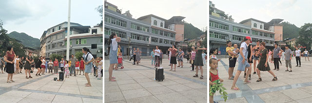 傍晚,同学们便按原计划前往广场,开展“五禽戏”走进广场舞活动。五禽戏是中国传统导引养生的一个重要功法,由华佗创编,从古到今,五禽戏被无数疾病患者作为康复治疗的辅助手段而广为传播,2011年被国务院命名为第三批国家级非物质文化遗产项目。队员们教授当地村民学习五禽戏不仅可以让他们在一天劳作后活动筋骨,疏通经络,气血循环且能防病祛病,强身健体,而且可以增进村民们的感情,练习的过程中增加快乐,让村民业余文化生活多姿多彩。在介绍完五禽戏后,广场上的阿姨们已经迫不及待地跃跃欲试。于是,同学们便在广场中心展开了五禽戏教学。授者认真,习者努力,阿姨们对同学们表达了感谢,她们希望既简单又养生的五禽戏可以被带给其他人,从而让更多的人学会养生之道。